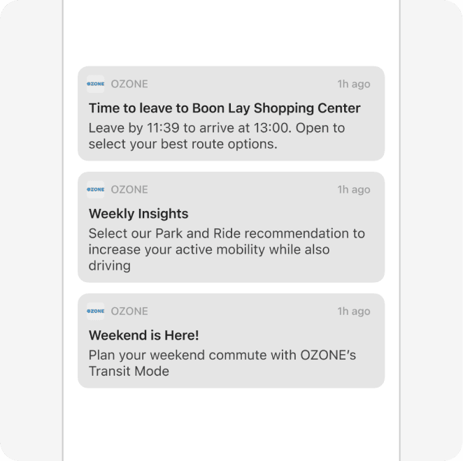 Nudges also comes from the push notifications. It ranges as a tool to promote car-lite, a reminder to start the commute and a reminder to catch up with the weekly insights provided by OZONE.