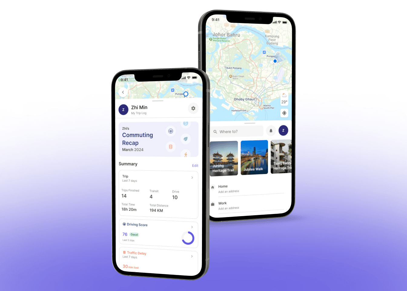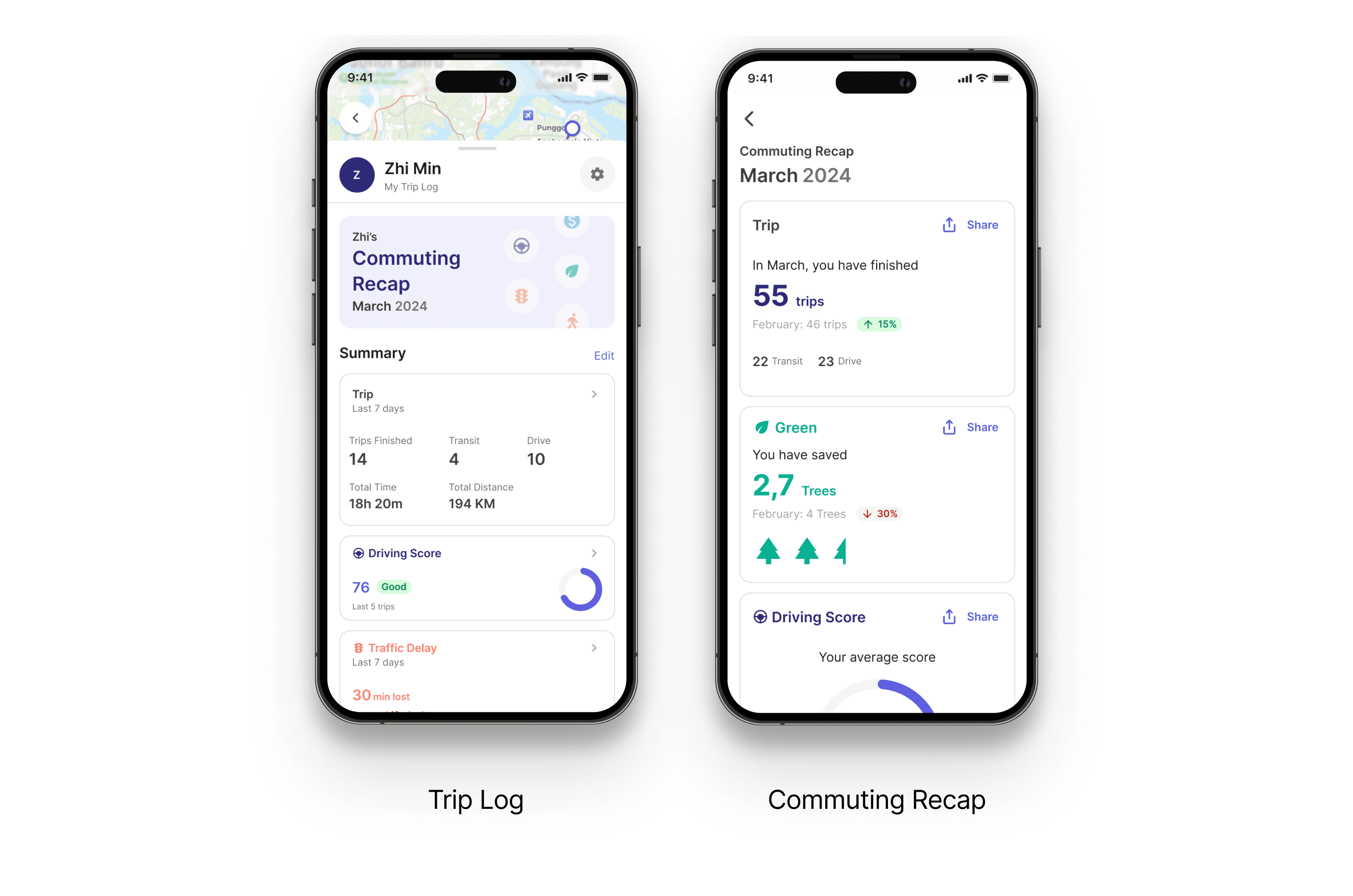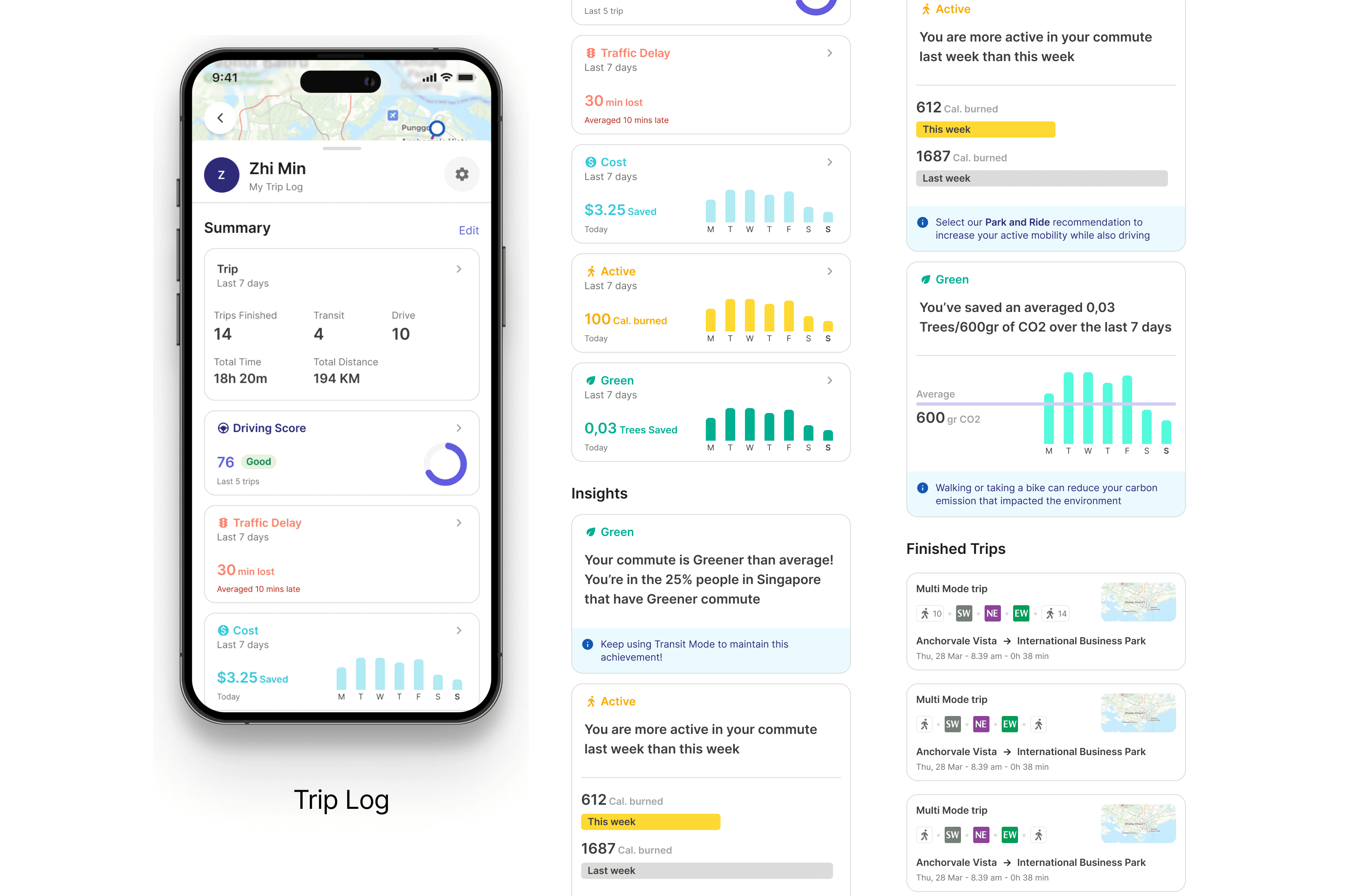 user will have a trip log to monitor their commuting activities and summaries, including insights that provided by the syetem to recommend actionable items towards active mobility and car-lite activities.