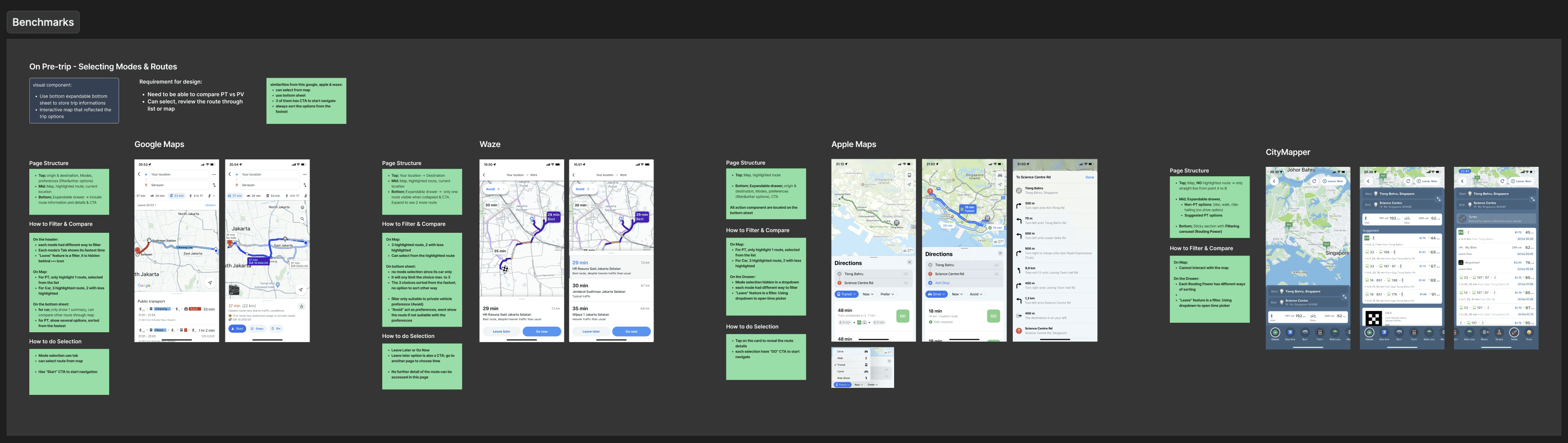 By taking the good examples of journey planner framework and best practice of applying nudge, I assumed that my benchmark from 4 mobility product is enough to start the design exploration.
