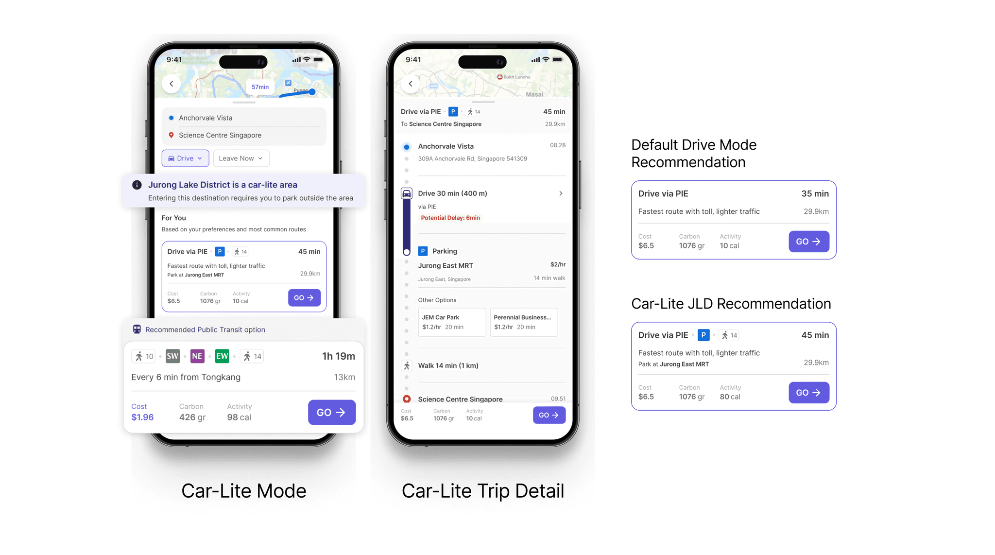 The nudge is designed to be place-sensitive especially the one that related to Jurong Lake District (JLD). As JLD will be a car-lite area, when JLD set as destination, it will give: 1.) Public Transport Recommendation, and 2.) Combination of Parking+Walk/Cycle, as an option to enter JLD area with private car.