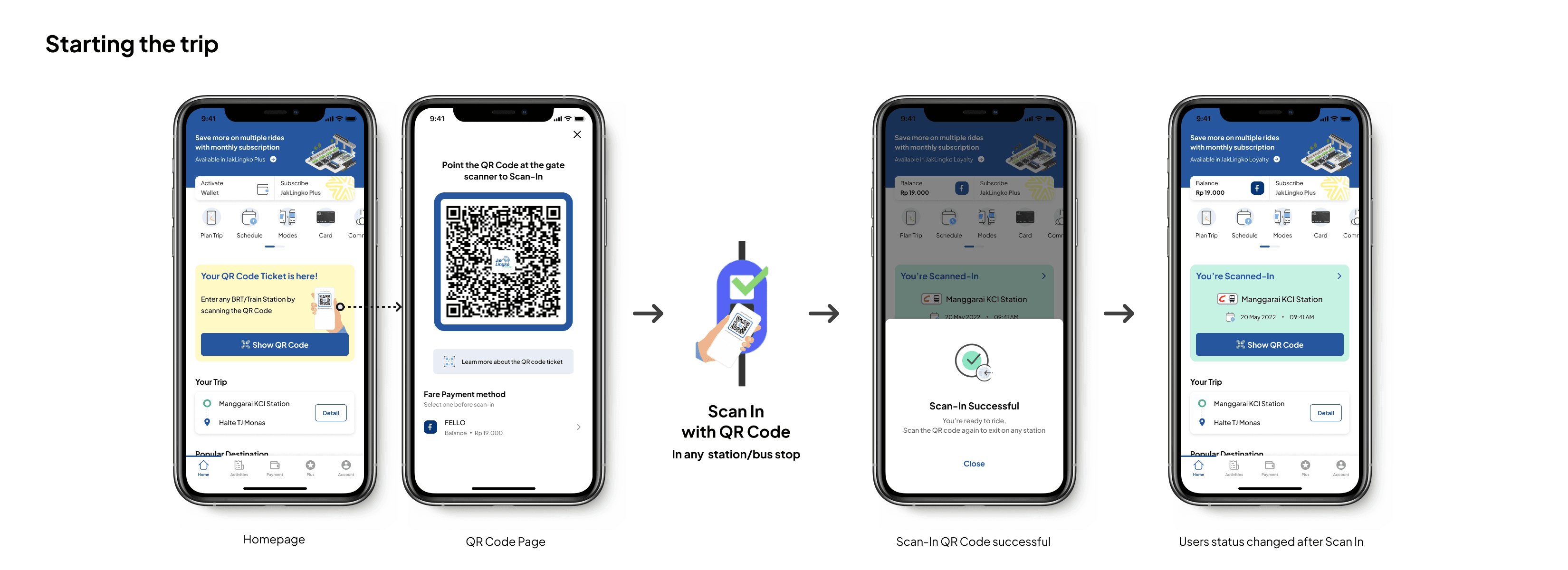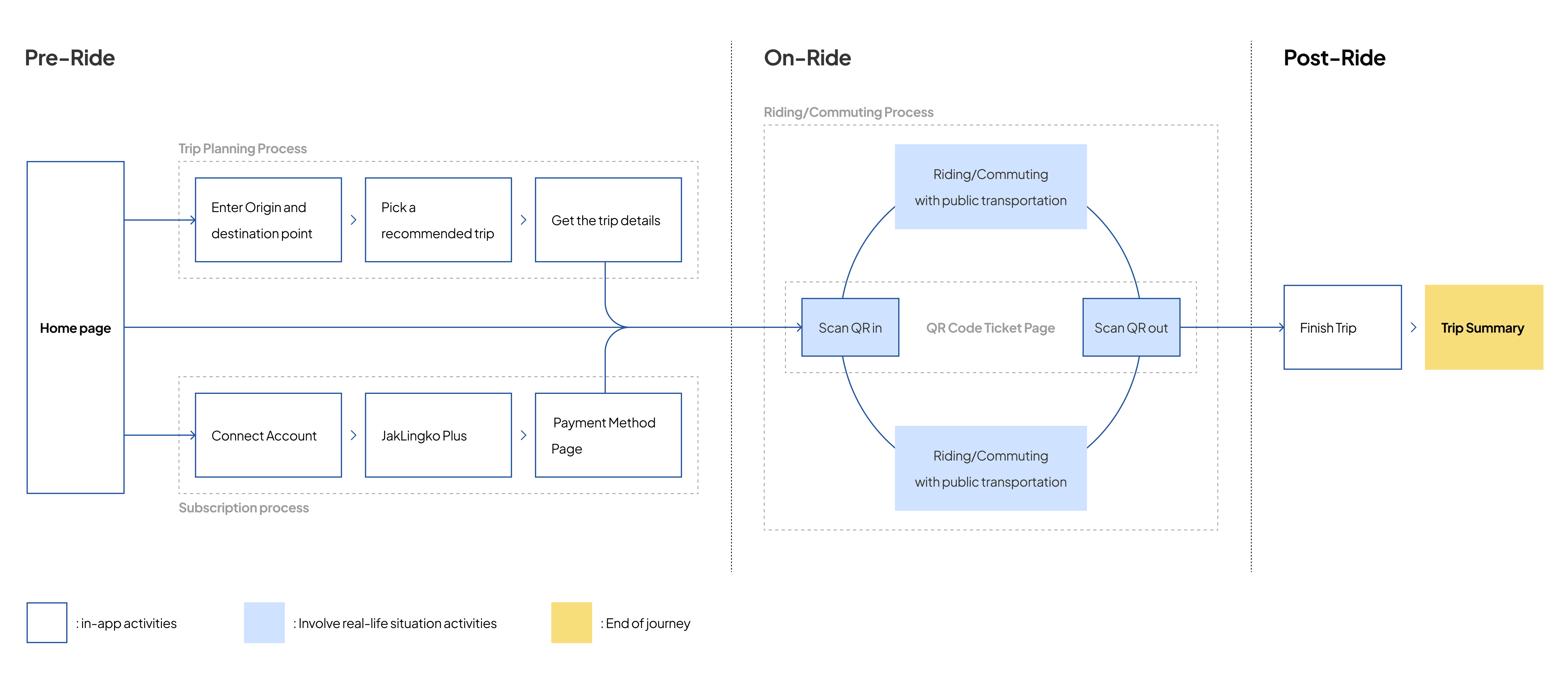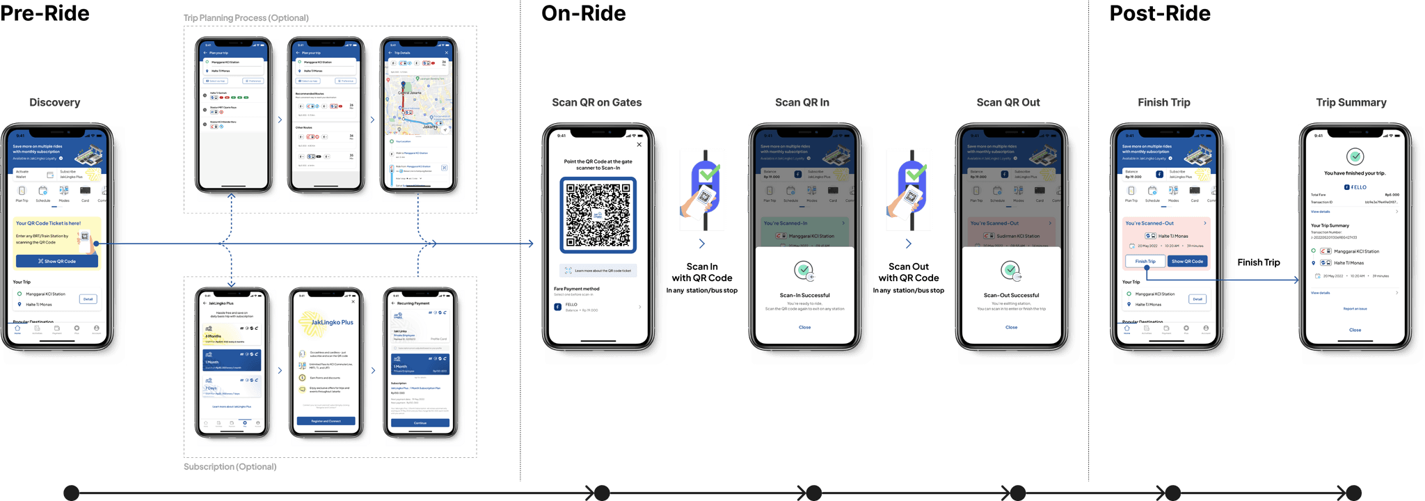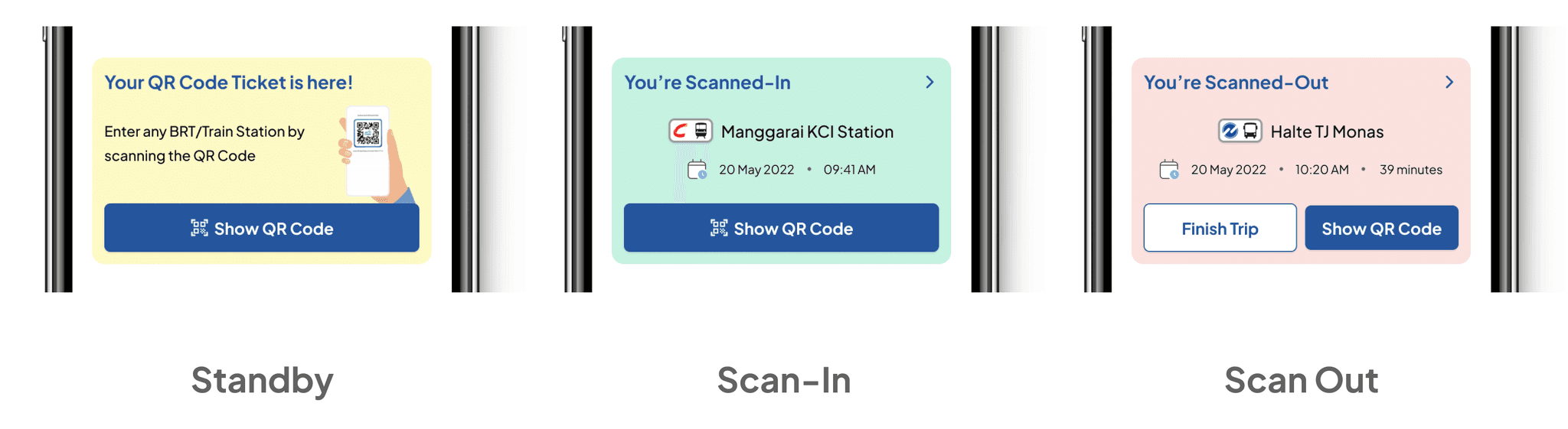 The QR code ticket page are included in Riding/Commuting process (In-Ride phase) to focus on JakLingko main function as a ticket to commuting with public transportation. Meanwhile Trip Planning and Payment method are separated in Pre-Ride phase so it can be done before Riding/Commuting process.