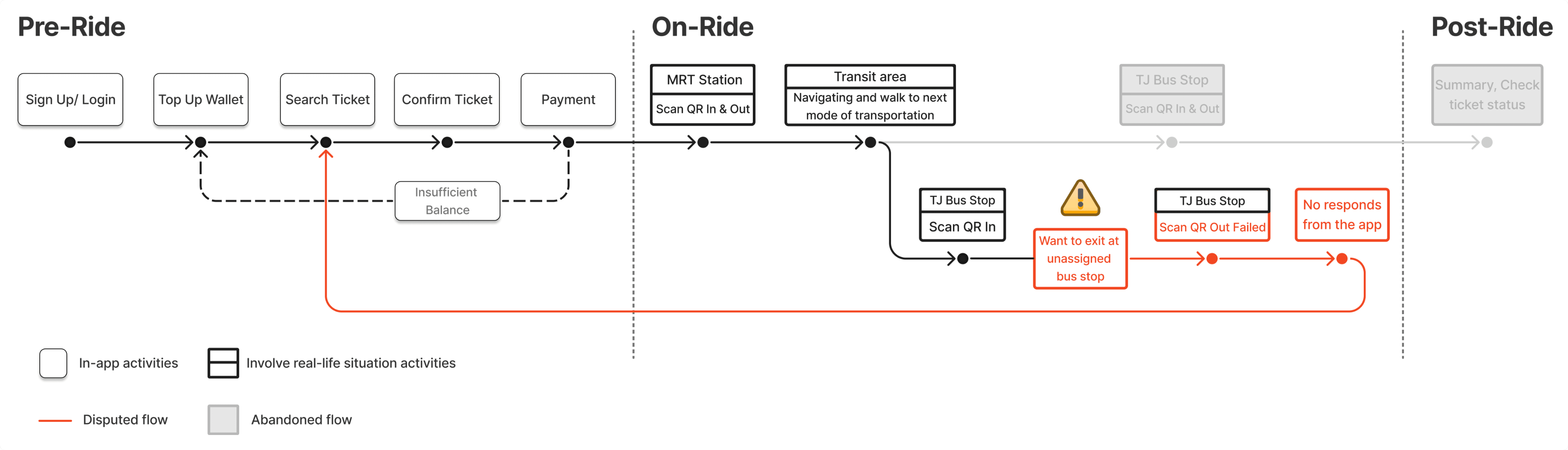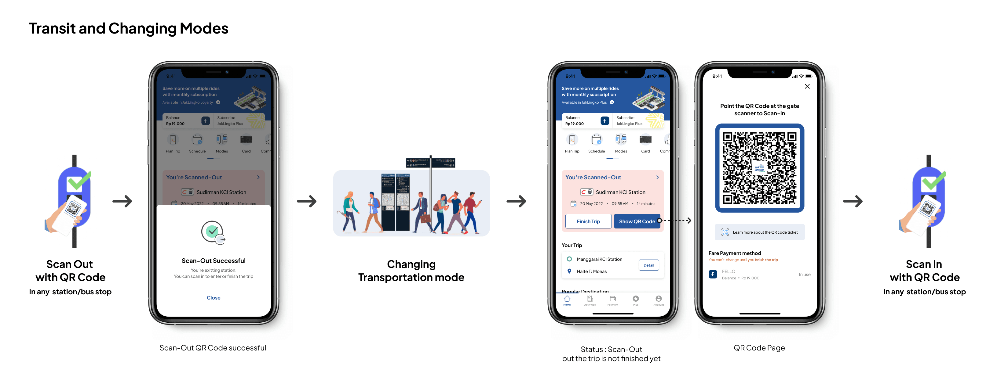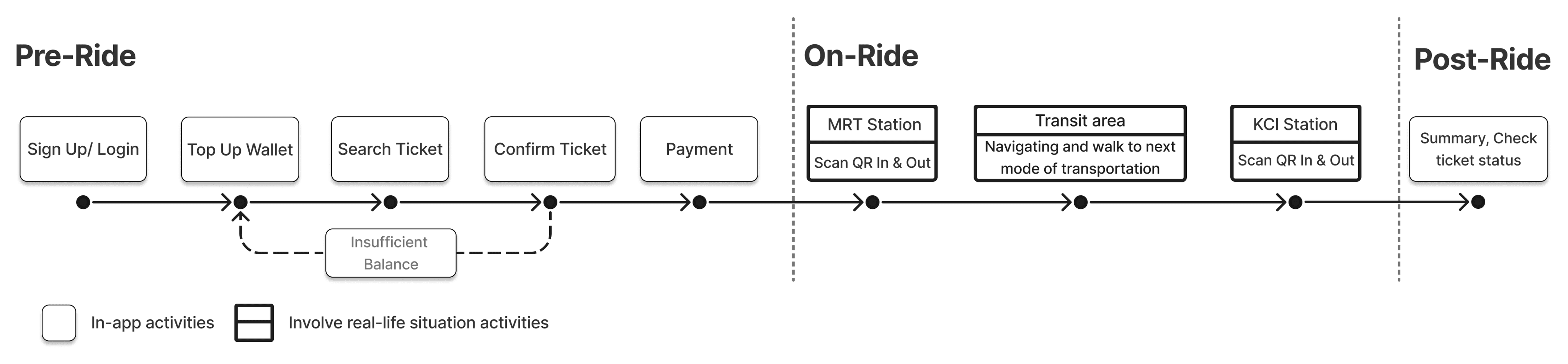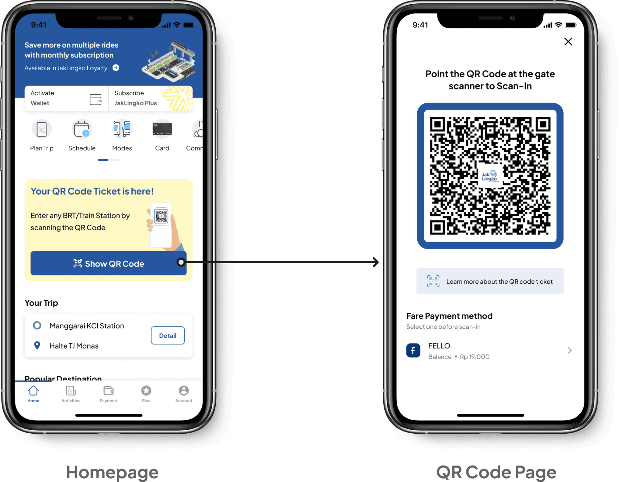 The QR code ticket page are included in Riding/Commuting process (In-Ride phase) to focus on JakLingko main function as a ticket to commuting with public transportation. Meanwhile Trip Planning and Payment method are separated in Pre-Ride phase so it can be done before Riding/Commuting process.