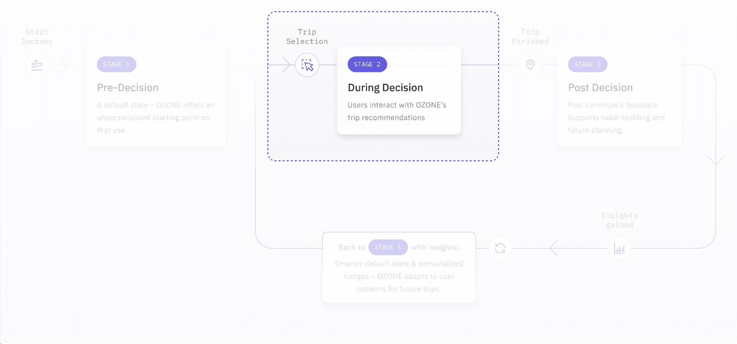 After hand-off, OZONE moved from a journey planner to a behavior-change system. The three-stage nudge strategy turns everyday commutes into a habit loop—prime the choice → guide the choice → reflect & reinforce → back to a smarter default.