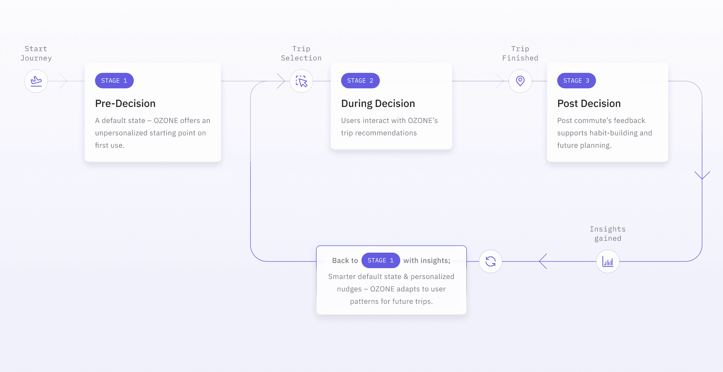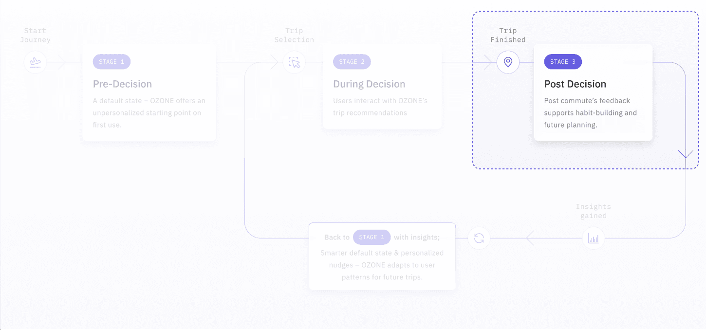 Stage 3 turns trips into insights; Stage 1 turns those insights into timely defaults and notifications. The loop closes as OZONE updates the home screen and nudges with context so the next commute starts smarter.