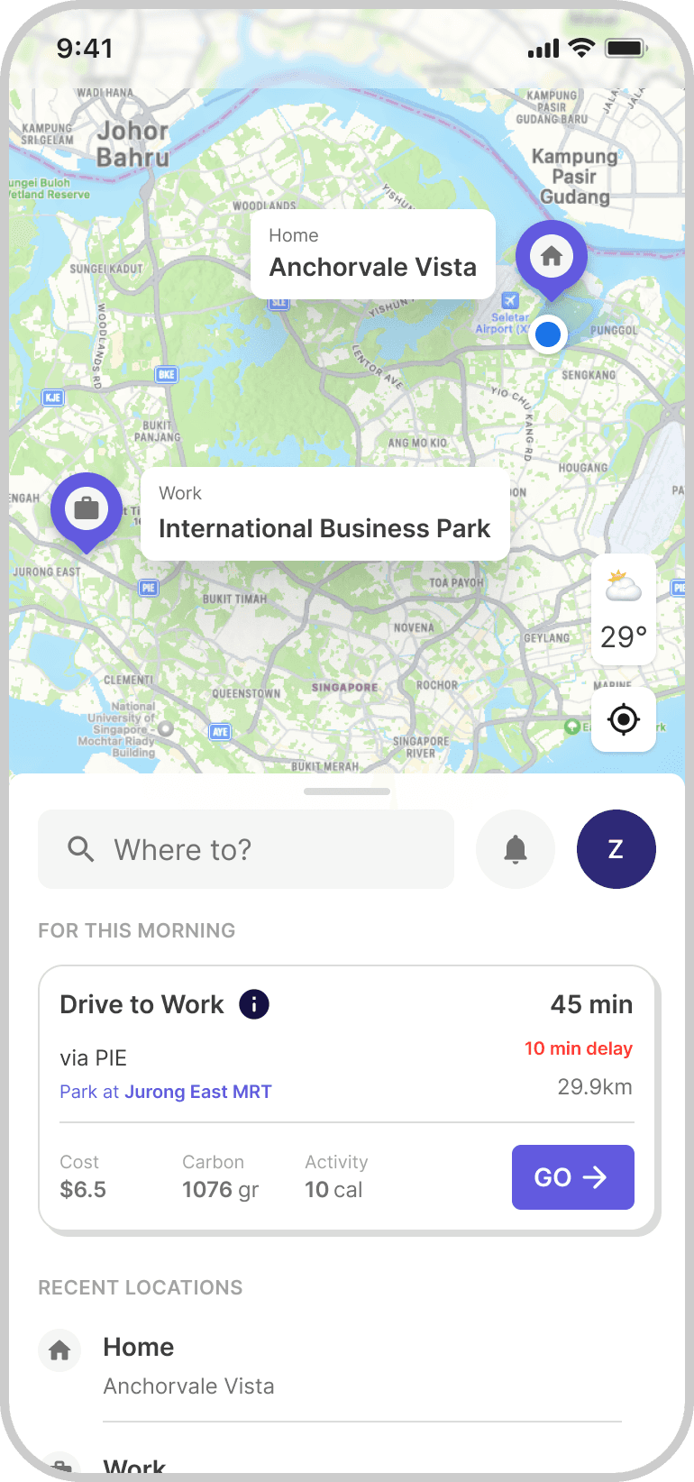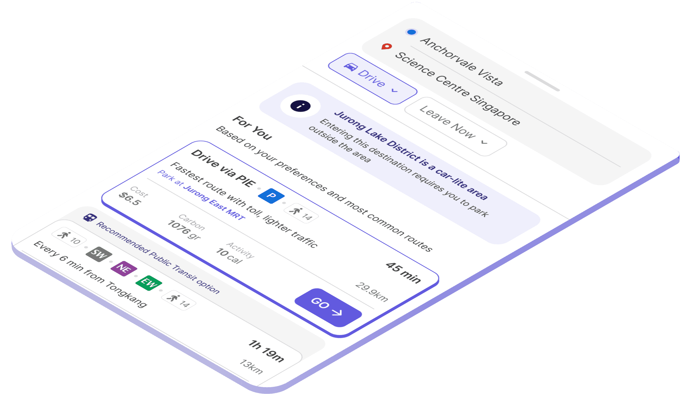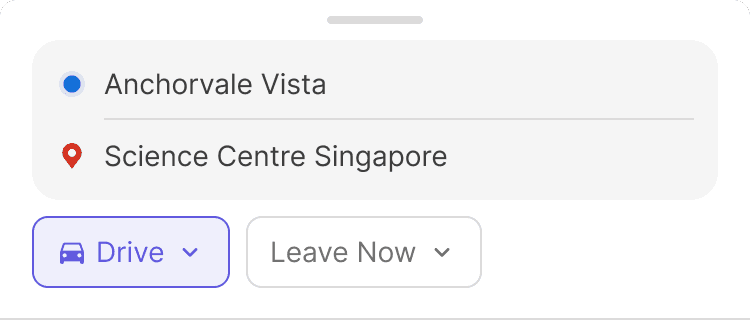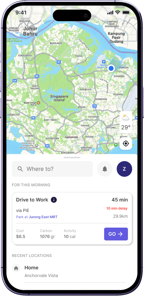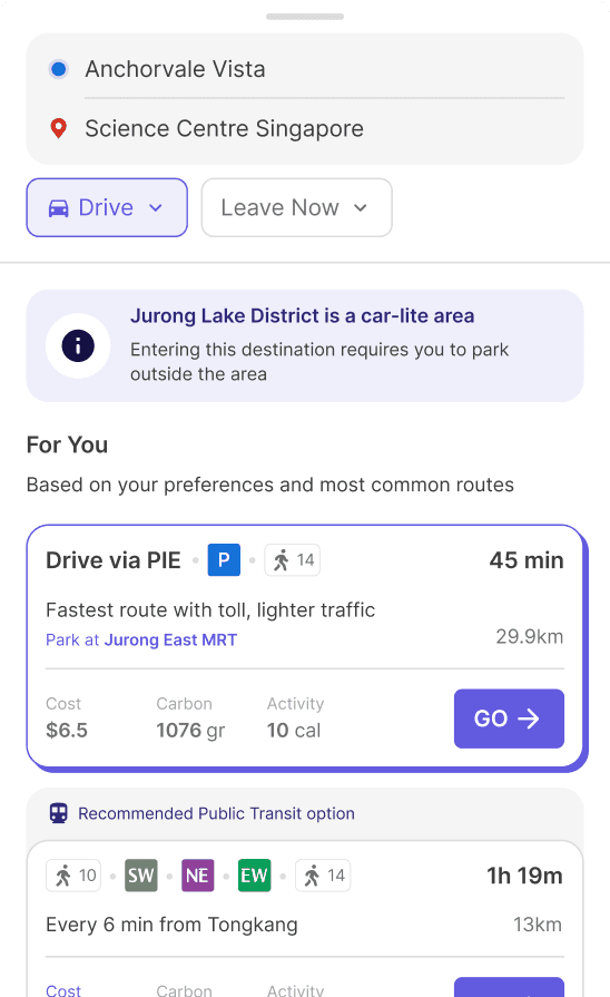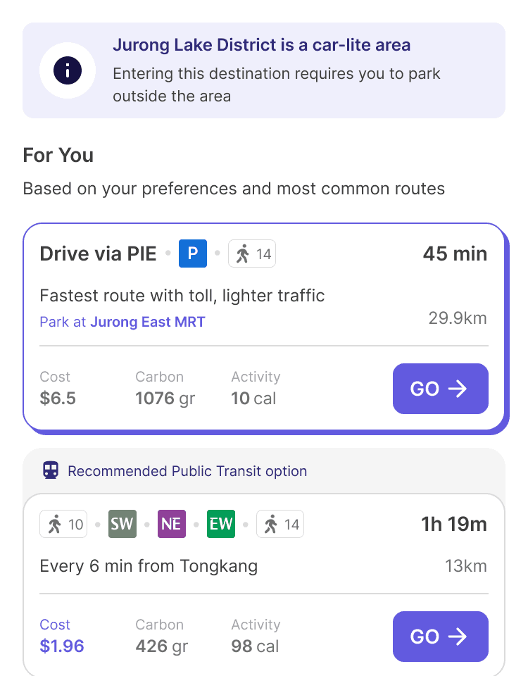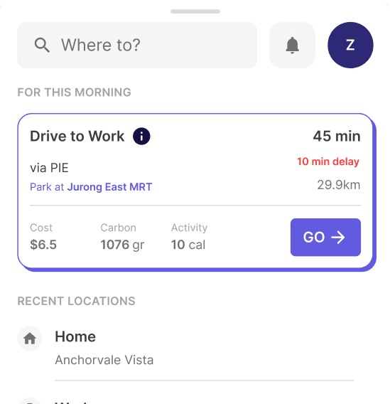 With just 2 inputs above, OZONE could begin to recommend the best route for today, One tap to go—no need to plan from scratch.