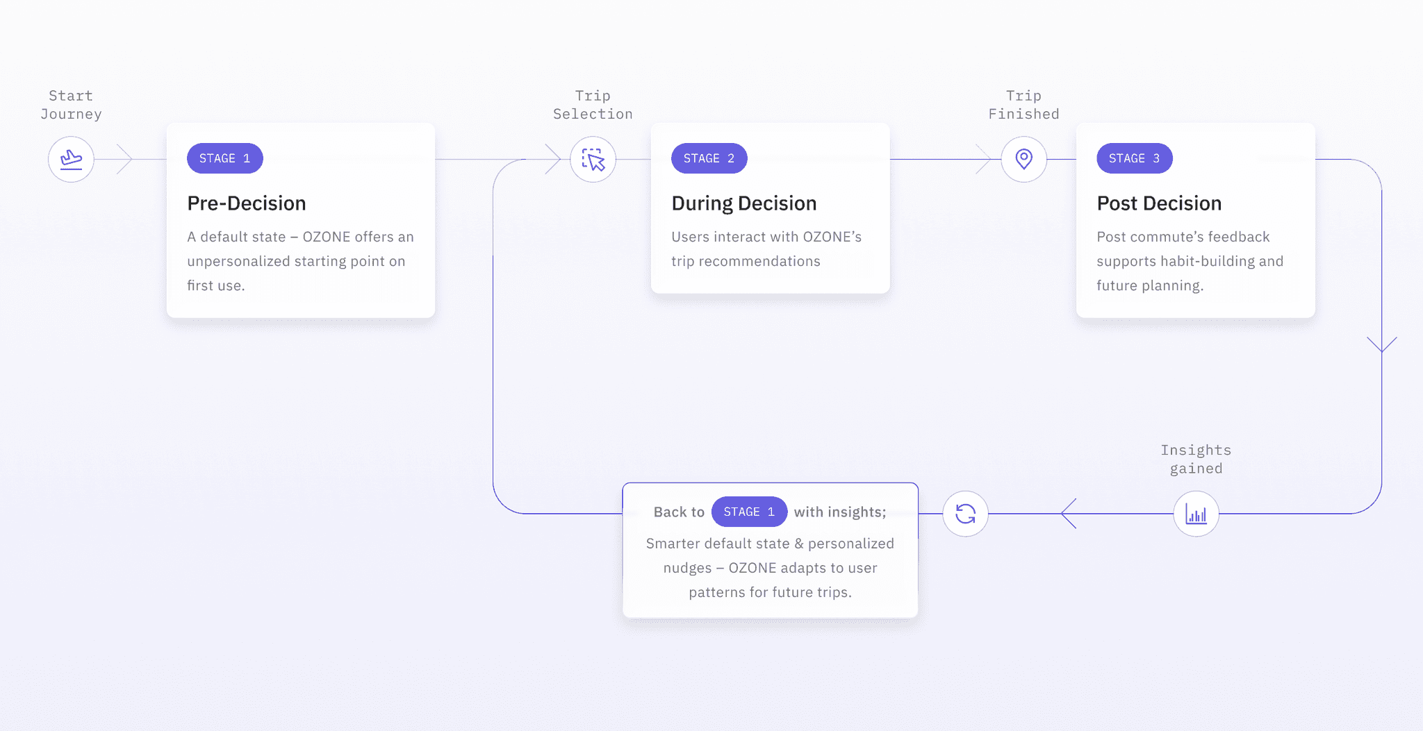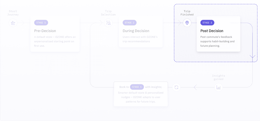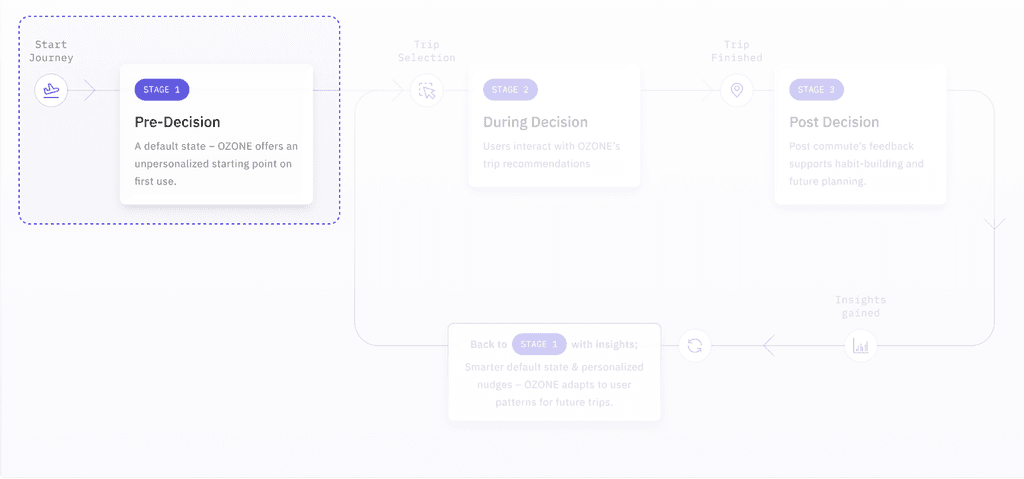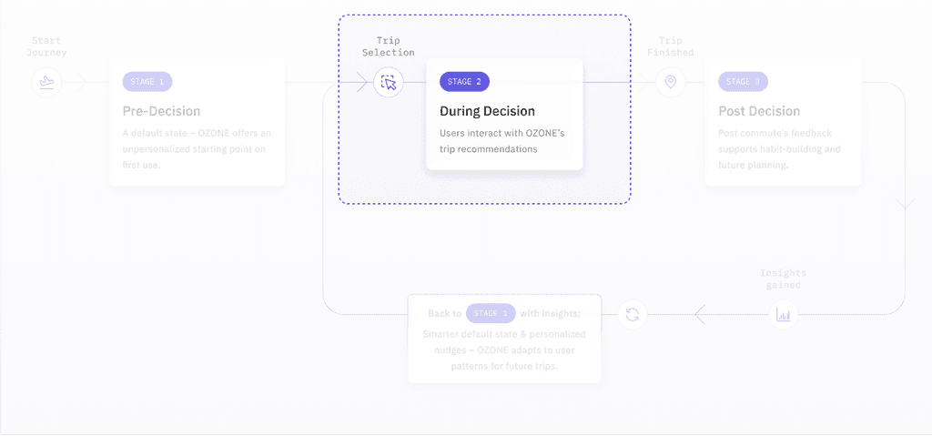Across this loop, OZONE adapts to the user's decisions: starting with a neutral state, then guiding them through low-friction choices, and finally learning from their feedback. These insights are fed back into the system, allowing OZONE to evolve with the user-surfacing smarter defaults and more relevant nudges on their next trip.