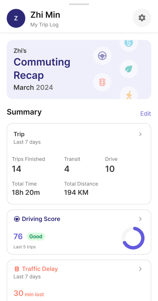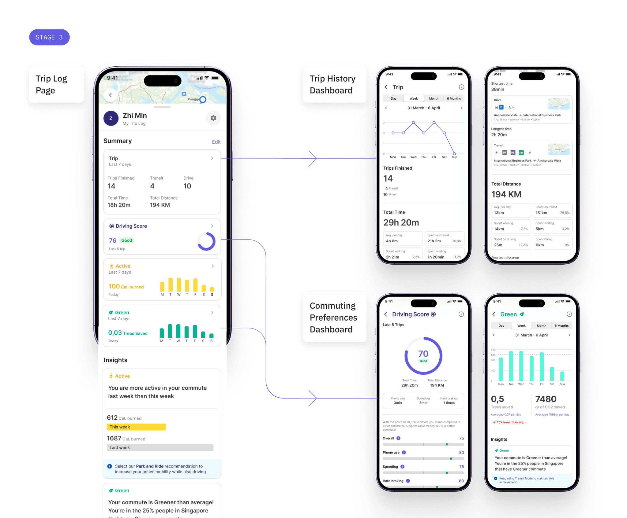 Once users finished trips and continue to engage with OZONE, they begin to see the impact of their commuting behavior reflected back through visualized data in Stage 3. This stage is represented through the Trip Log page, supported with more pages that shows detailed breakdown of each data.
