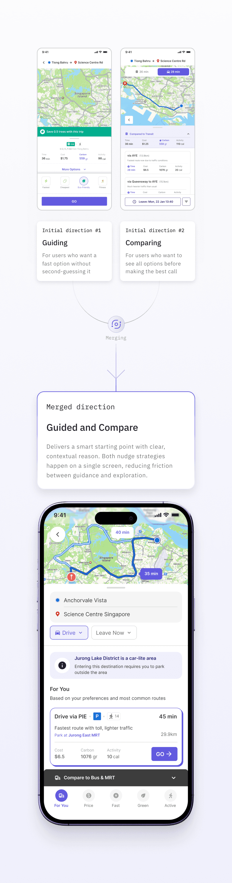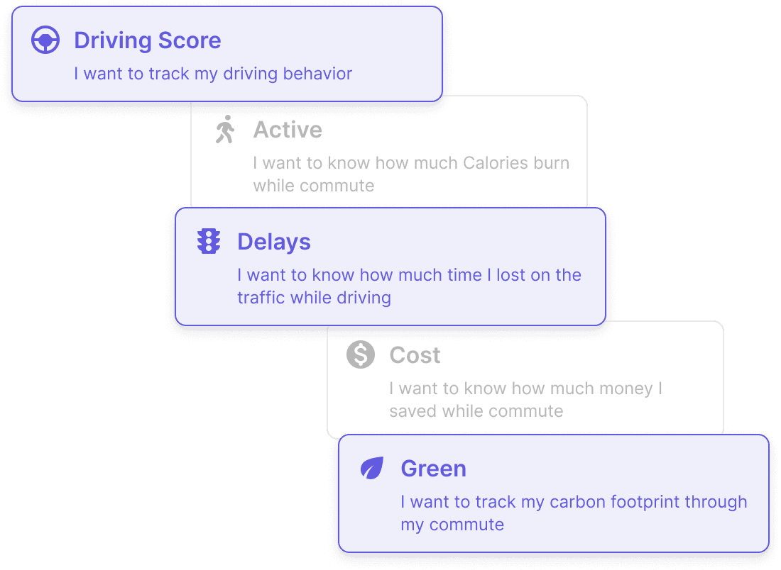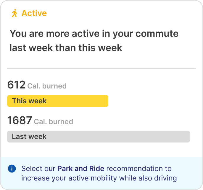 To encourage car-lite behavior, I adopted a behavioral design approach based on the proven nudge theory. I structured the behavioral cues to align with key decision points in the user journey; (1) before, (2) during, and (3) after the trip.