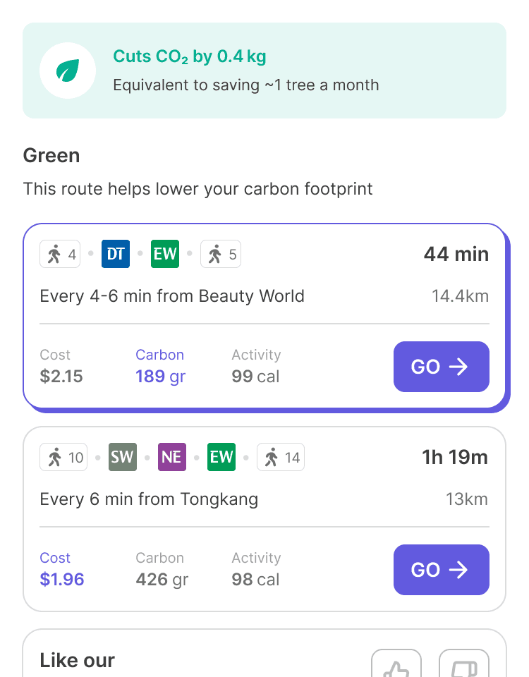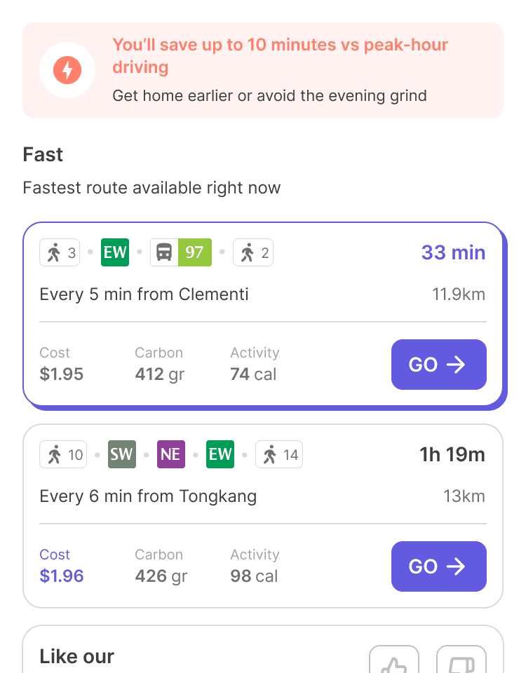 This shifts the experience from passive suggestion to empowered decision-making. Once origin and destination are set, the interface reveals the most relevant routes in a clear, value-aligned format.