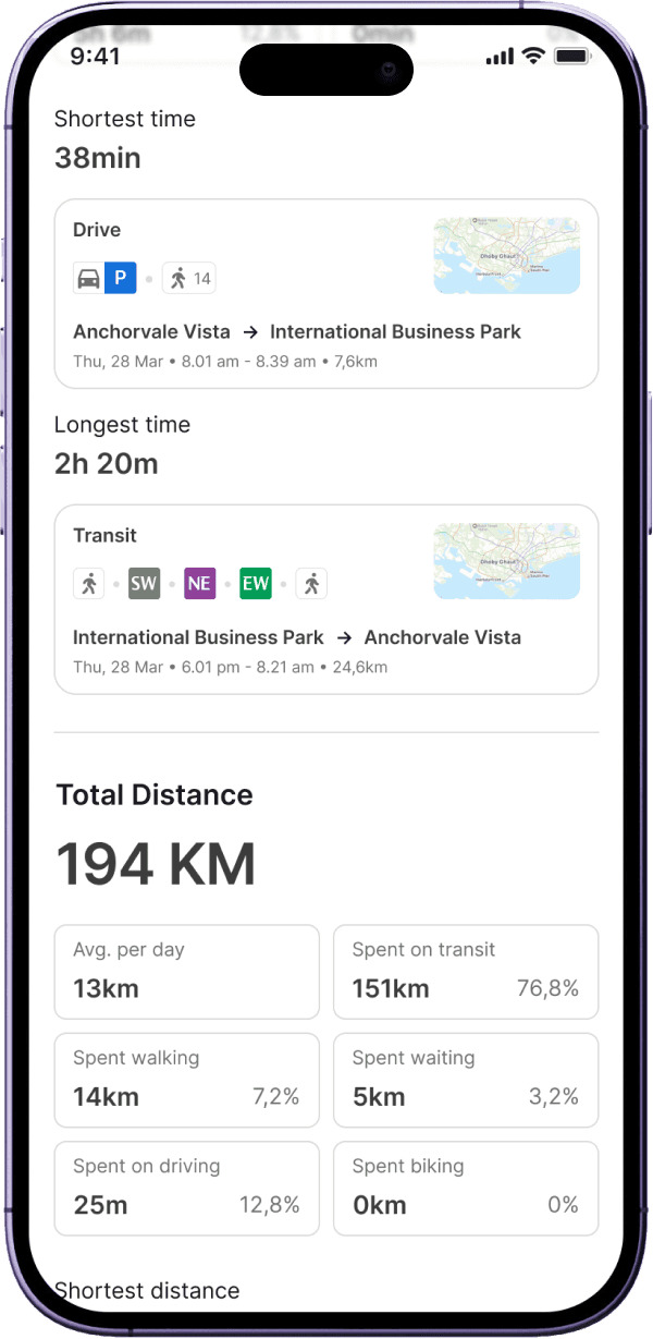 A mobility planning experience that promotes car-lite behavior by enabling intuitive route comparison between public and private transport, supported by subtle behavioral nudges.