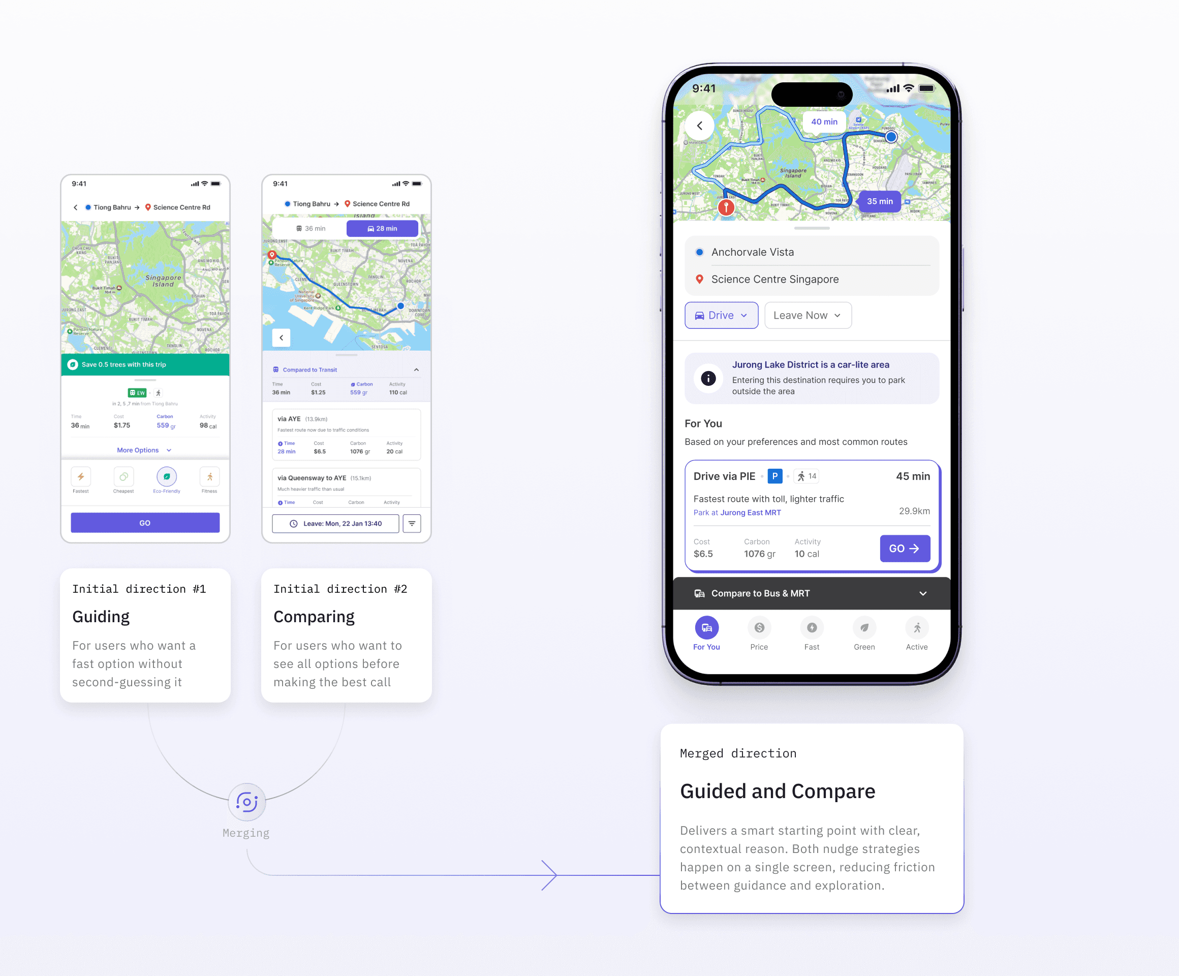Beyond technical capabilities, I mainly looked at how each platform uses subtle behavioral nudges to influence commuter choices. From what I found of the best practices, I was able to shaped a clear design intention