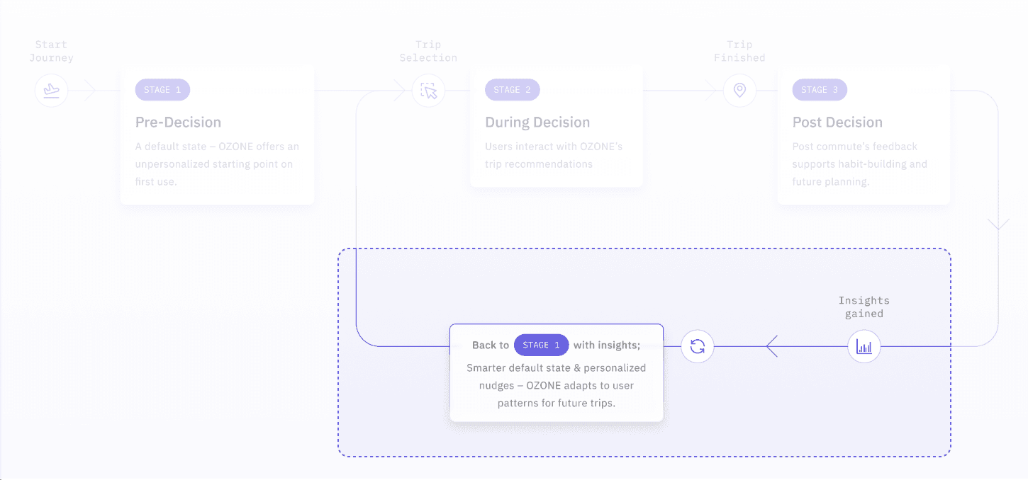 After hand-off, OZONE moved from a journey planner to a behavior-change system. The three-stage nudge strategy turns everyday commutes into a habit loop—prime the choice → guide the choice → reflect & reinforce → back to a smarter default.