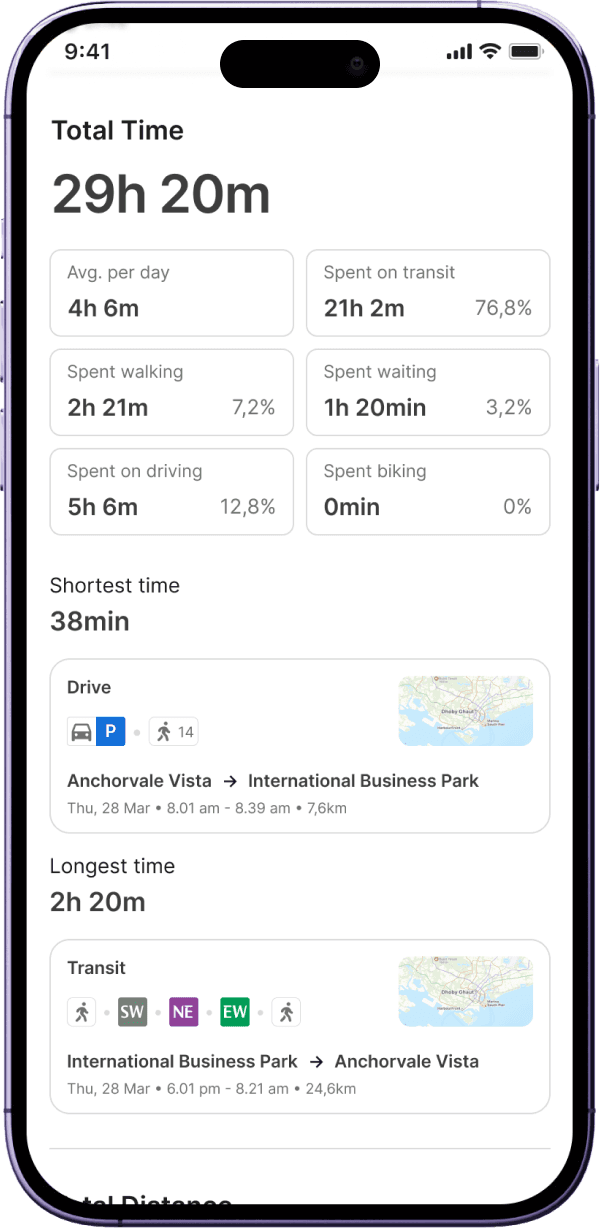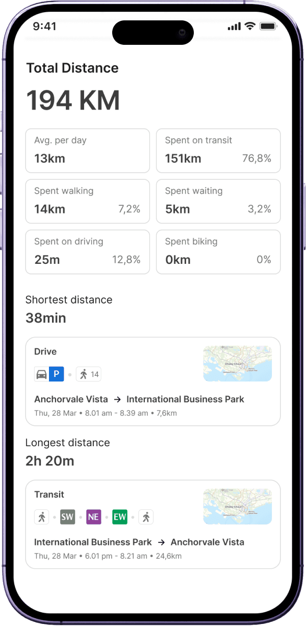 A mobility planning experience that promotes car-lite behavior by enabling intuitive route comparison between public and private transport, supported by subtle behavioral nudges.
